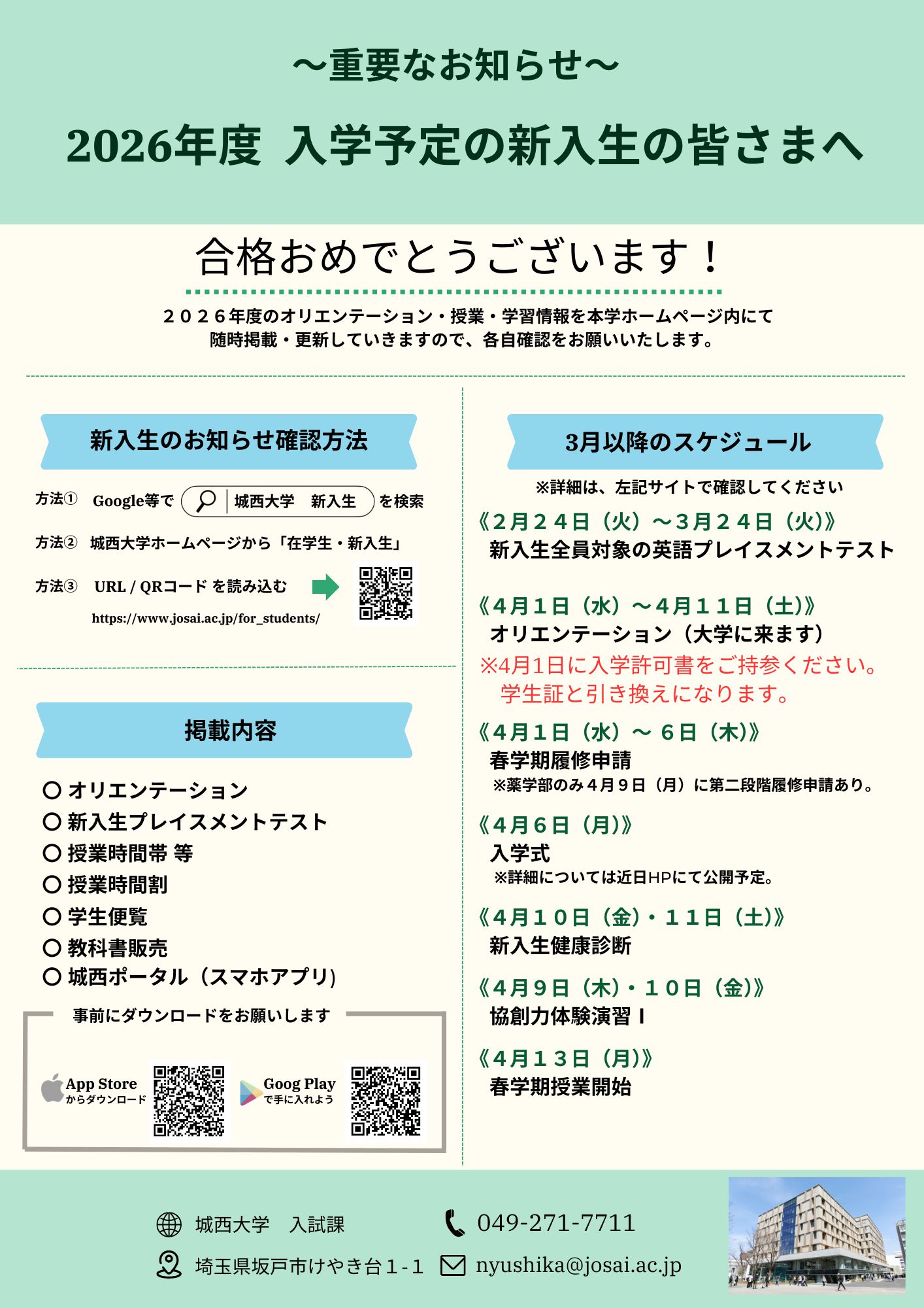 2026年度オリエンテーション案内 合格おめでとうございます。 入学予定者の方へ2026年度のオリエンテーションのお知らせです。 下記サイトより各学部の予定をご確認ください。 ※入学式の詳細については、後日HPに掲載予定です 2026年度オリエンテーションスケジュール